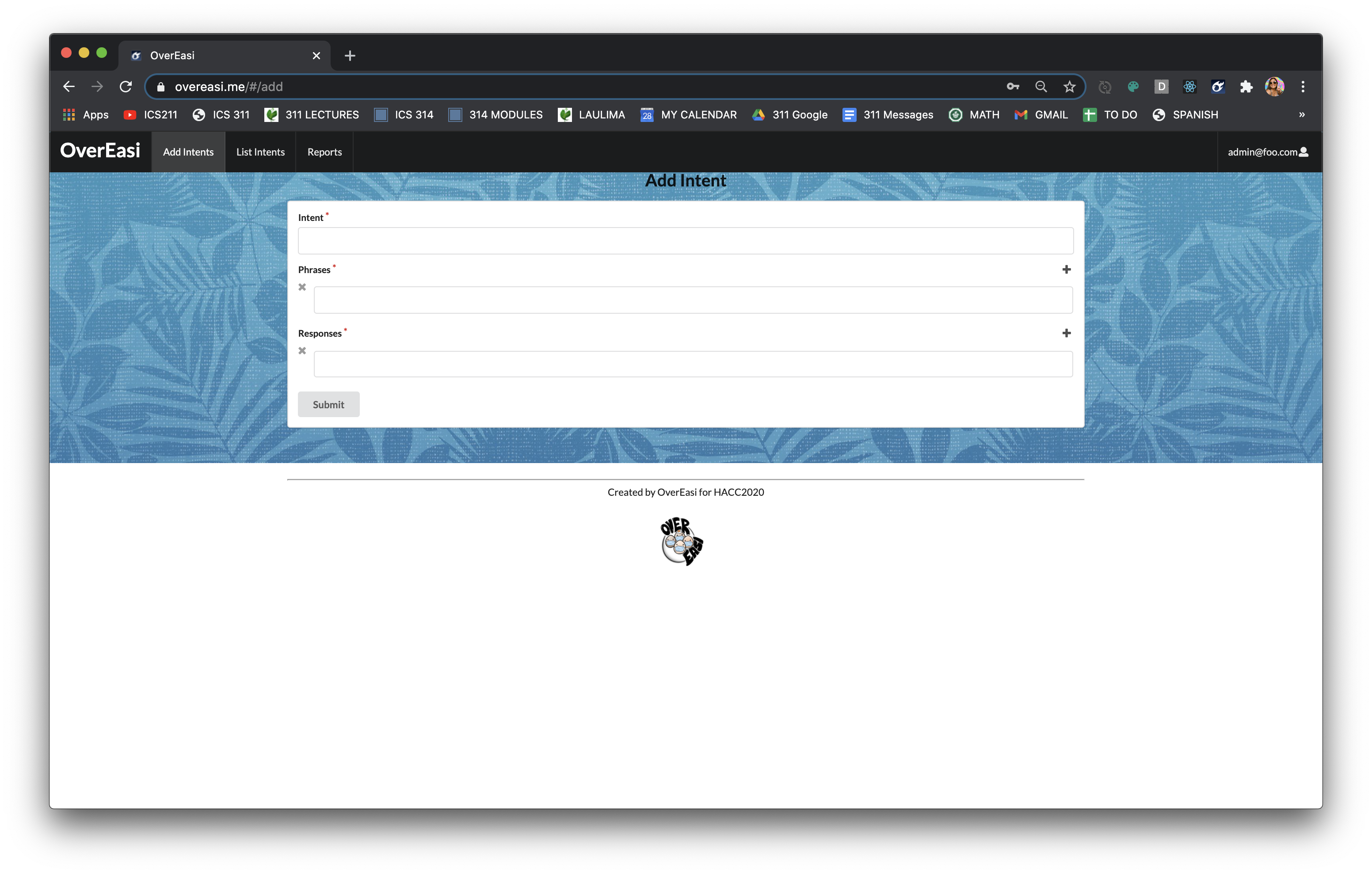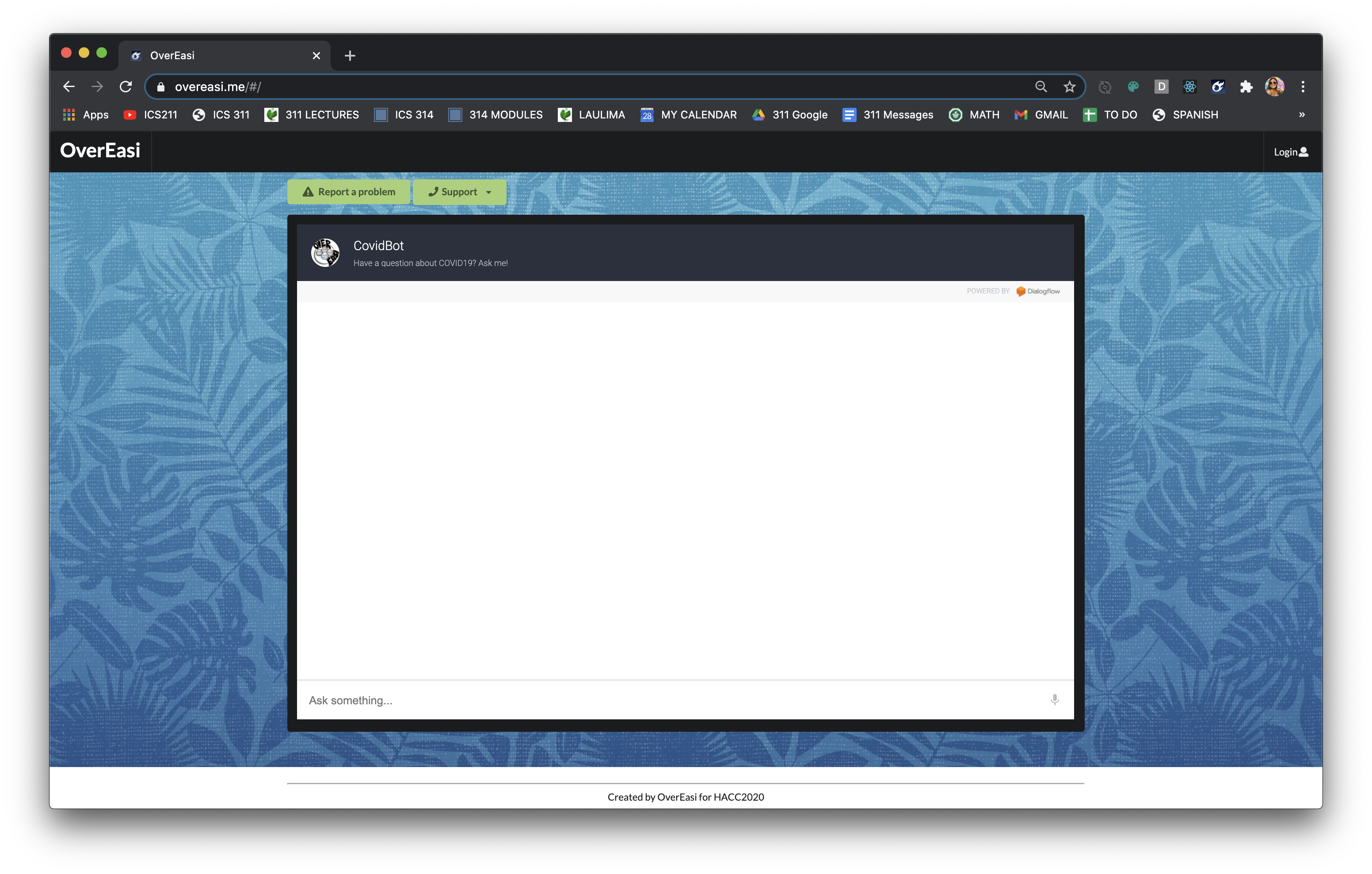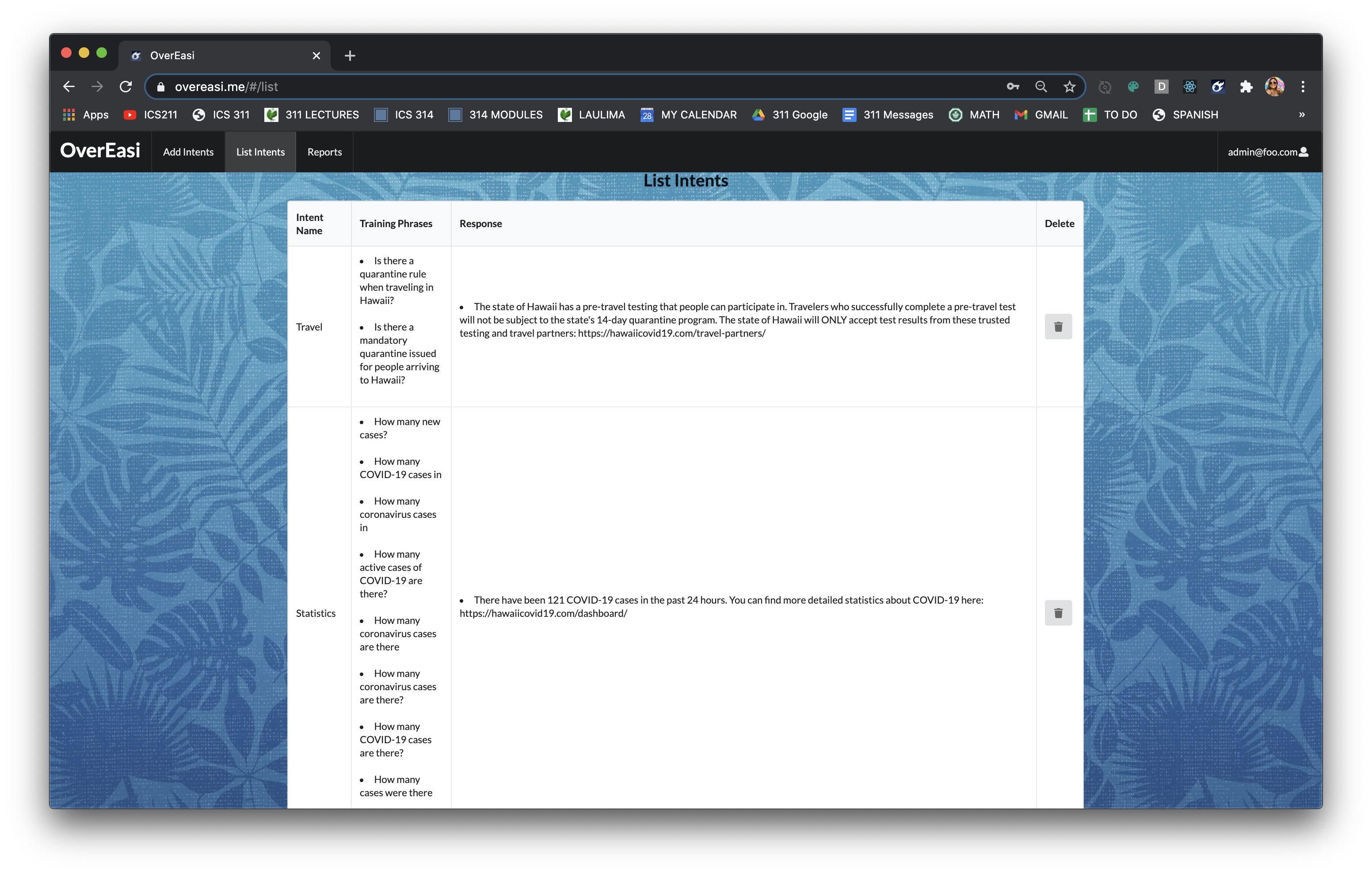The goal of this application is to provide a one-stop-shop for COVID-19 information related to Hawaii. Besides the chatbot, it incorporates the Dialogflow Google Cloud Service, and implements pages accessible only to the admin that allow for easy maintenance of this bot. For example:
